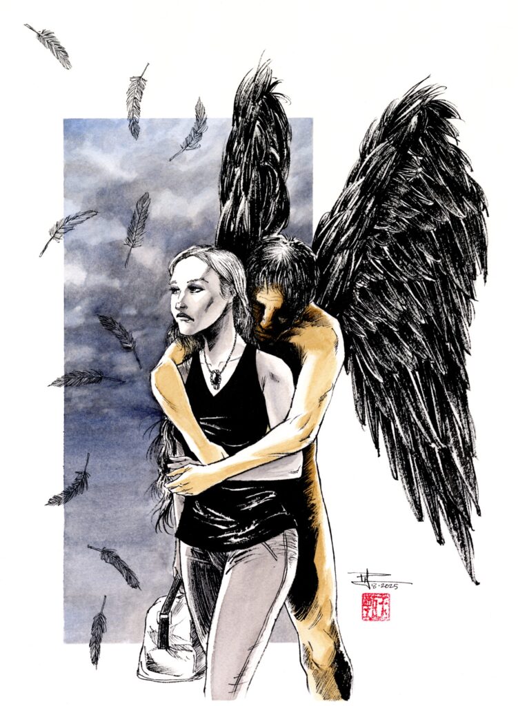 Real (click image for lightbox view) Love. Togetherness. History. Choices. The future. Darkness. Happiness. Adventure. What is real? Ink and watercolor 11×15 140lb Arches cold press watercolor paper. August 2025